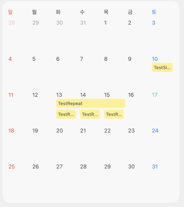 const MonthHeader = () => { return ( <View style={{ flexDirection: 'row' }}> {weekdays.map((day, index) => { const isSunday = index === 0 const isSaturday = index === 6 return ( <View key={day} style={{ flex: 1, alignItems: 'flex-start', paddingVertical: 8, paddingHorizontal: 2, }} > <AppText style={{ fontSize: 12, fontWeight: '400', color: isSunday ? '#FF3B30' : isSaturday ? '#007AFF' : theme.app_theme_text_color, }} > {day} </AppText> </View> ) })} </View> ) } const getEventStyle = (event: CalendarEvent) => { const findCategory = todoStore.categories.find(category => category.id == event.category_id) const background = findCategory?.color return { backgroundColor: background, borderRadius: 4 } }하지만 요일은 props로 커스텀을 할 수 있었지만, 날짜는 커스텀 props를 찾지 못해서 결국 라이브러리에서 날짜 색상을 건드리는 부분을 찾아서 바꾸기로했다.