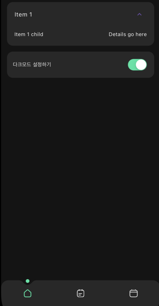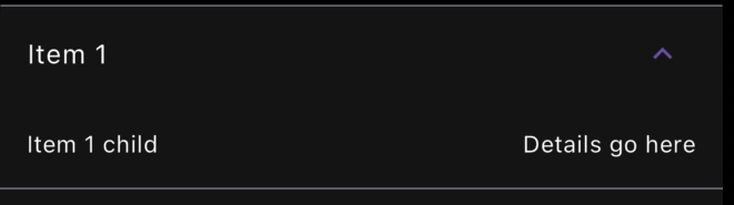 bool _isExpanded = false; @override Widget build(BuildContext context) { return ExpansionTile( title: Text('Item 1',style: TextStyle(color: textColor)), children: [ Padding( padding: EdgeInsets.all(16.0), child: Row( mainAxisAlignment: MainAxisAlignment.spaceBetween, children: [ Text('Item 1 child',style: TextStyle(color: textColor),), Text('Details go here',style: TextStyle(color: textColor),), ], ), ), ], onExpansionChanged: (bool expanded) { setState(() { _isExpanded = expanded; }); }, ); }ExpansionTile을 이용하면 위 아래로 divider가 나와서 divider를 안보여주게 하기 위해서 투명색으로 적용