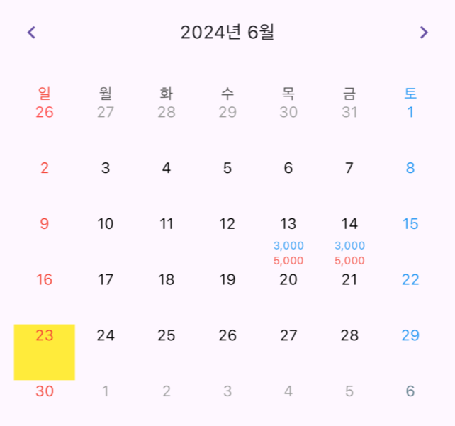 calendarBuilders: CalendarBuilders( outsideBuilder: BuildOutSideDay, defaultBuilder: BuildDefaultDay, selectedBuilder: BuildSelectedDay, todayBuilder: BuildToday, markerBuilder: BuildTextMarker, ),class Event { String title; Event(this.title); } Map<DateTime, List<Event>> events = { DateTime.utc(2024,6,13) : [ Event('3,000'), Event('5,000') ], DateTime.utc(2024,6,14) : [ Event('3,000'), Event('5,000') ], };Widget? BuildTextMarker(BuildContext context, DateTime date, List<Event> events) { if(events.isNotEmpty) { List<Event> eventList = events.cast<Event>(); return Positioned( bottom: 1, child: Column( mainAxisAlignment: MainAxisAlignment.center, children: [ BuildEventText(eventList[0].title, Colors.blue), BuildEventText(eventList[1].title, Colors.red) ], ), ); } return null; }BuildTextMarker의 파라미터는 BuildContext, DateTime, EventList, Holiday 이렇게 4개의 값을 받을 수 있으며,