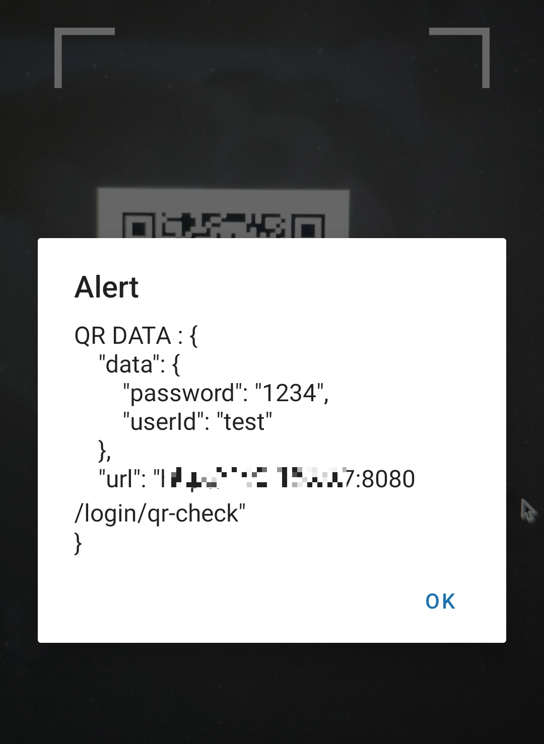 // QR 코드 생성 정보 int width = 200; int height = 200; // 사용자 데이터 (테스트) String url = "http://ip주소:8080/login/qr-check"; String userId = "test"; String password = "1234"; // 데이터 세팅 JSONObject data = new JSONObject(); data.put("userId", userId); data.put("password", password); // 최종 결과 JSON 객체 생성 JSONObject qrData = new JSONObject(); qrData.put("url", url); qrData.put("data", data);BitMatrix를 사용하여 바코드를 생성할 수 있으며
