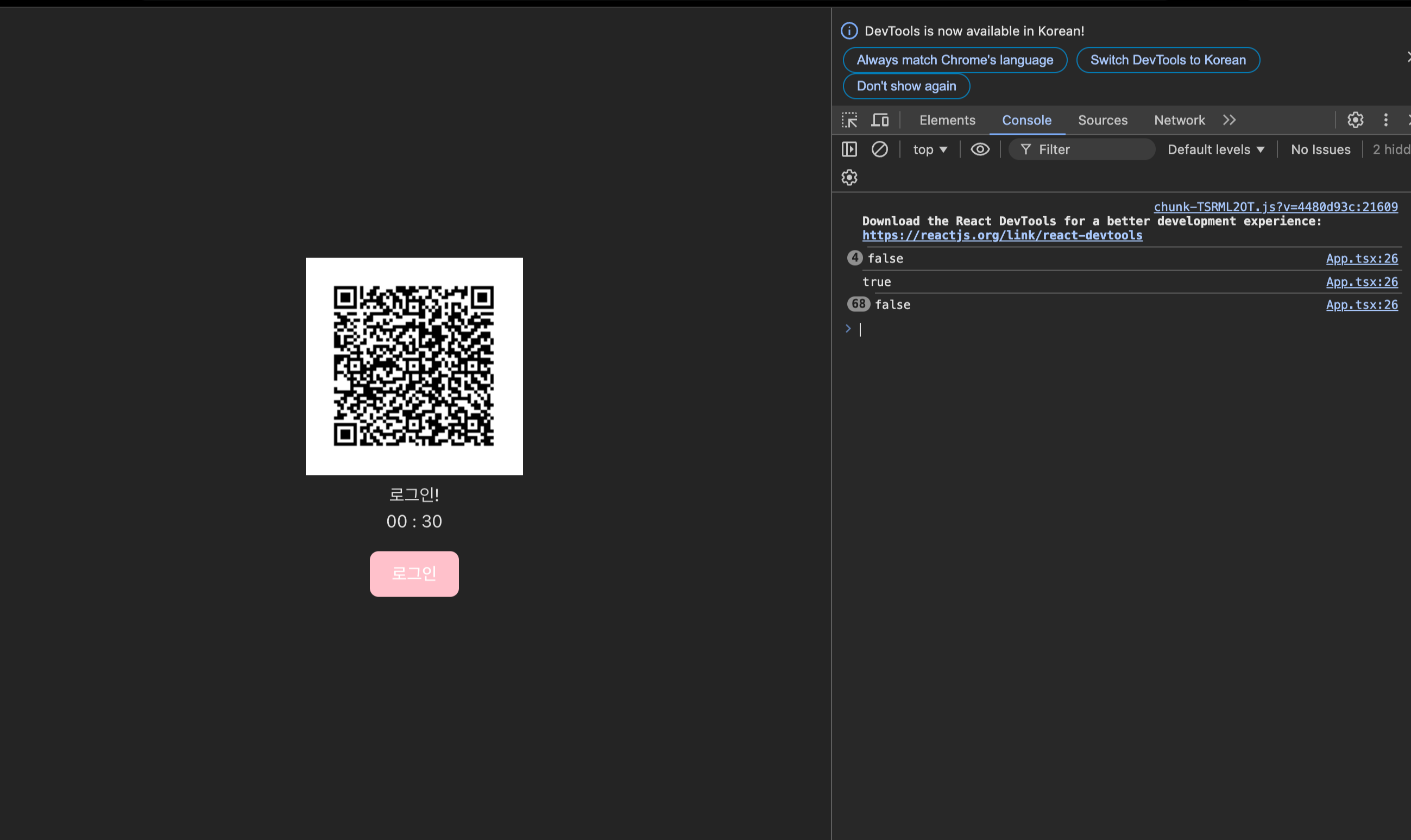false로 계속 나오다가 모바일로 QR코드를 찍는 순간 다음으로 전달된 값은 true가 온것을 확인할 수 있다.