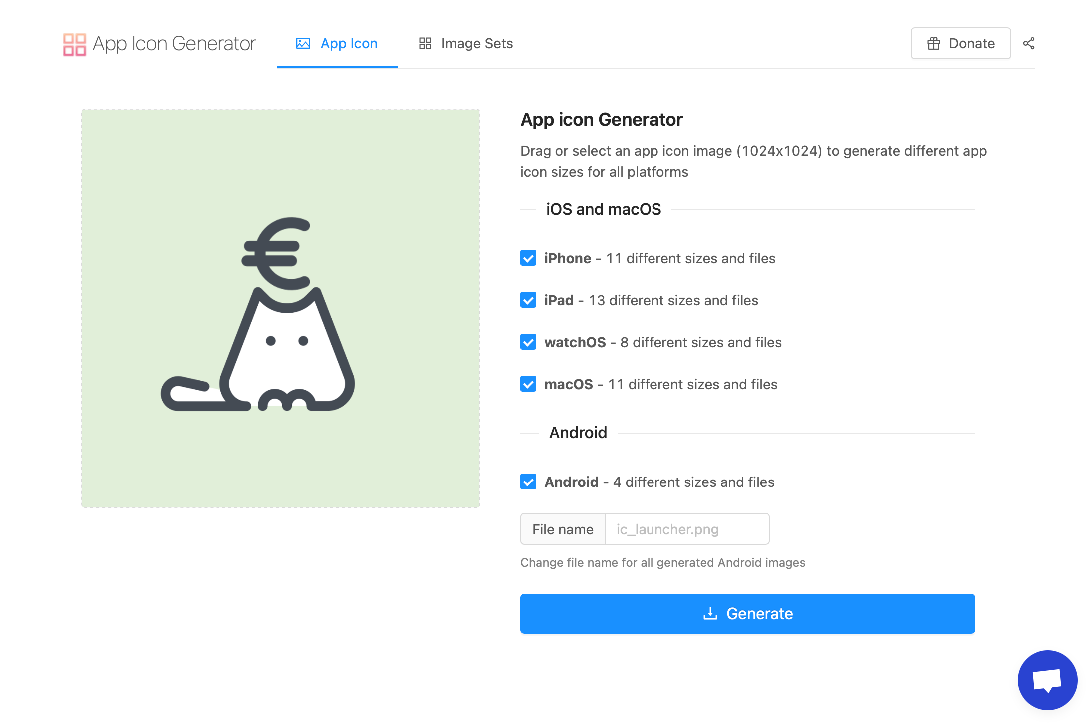 사용할 기종을 선택하여 생성을 누르면 모바일 환경 사이즈별로 아이콘을 생성해준다.