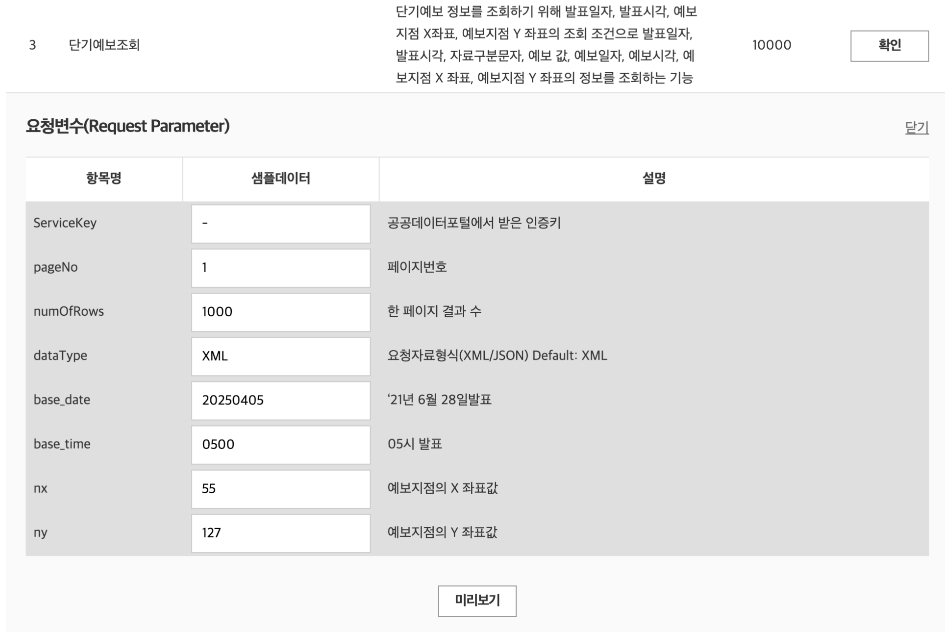 기상청 api를 사용하여 날씨 정보를 가져올때 각 api별로 보내야하는 파라미터가 달라서 사용하기가 까다롭다. 간단하게 설명을 위해 자세한 코드 실행 결과보다는 과정으로 설명 진행 ( 예외처