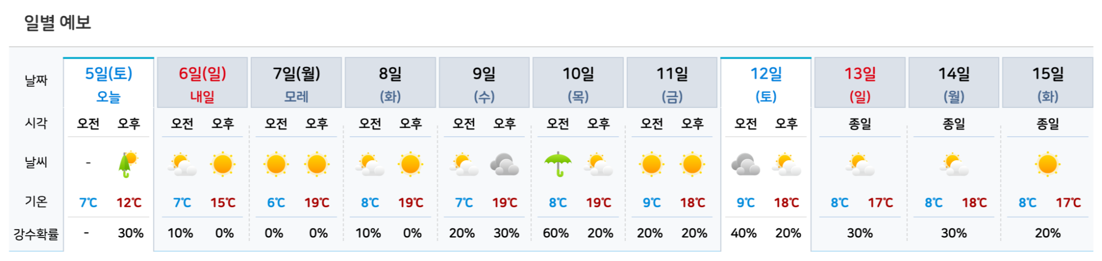 이후 주간 날씨 정보를 보면 최고온도, 최저온도, 강수 확률, 오전 오후 날씨를 보여준다.