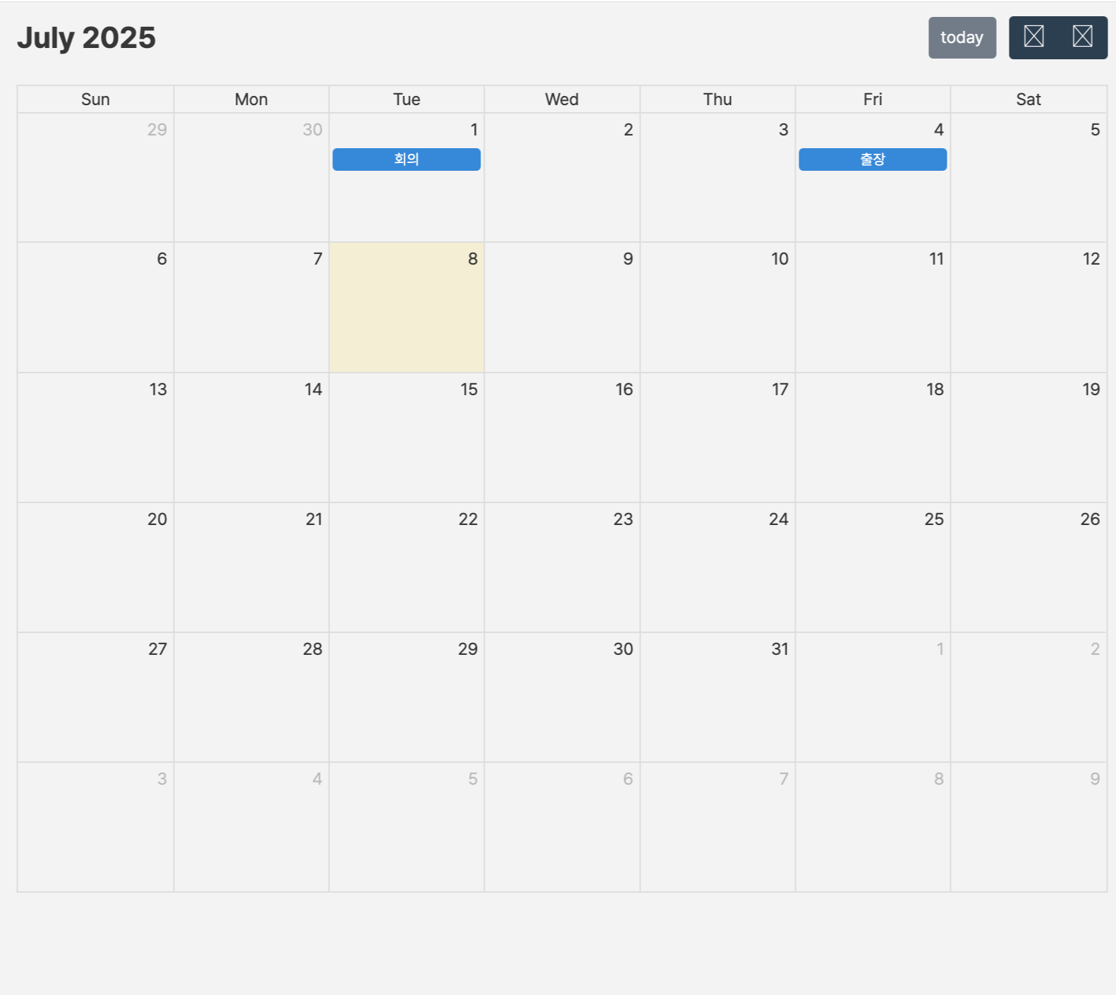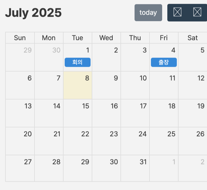 이러면 일단 fullCalendar가 화면에 렌더링 되는것을 볼 수 있다. 아이콘이나 ui/ux는 나중에 css로 작업하면 되기에 무시