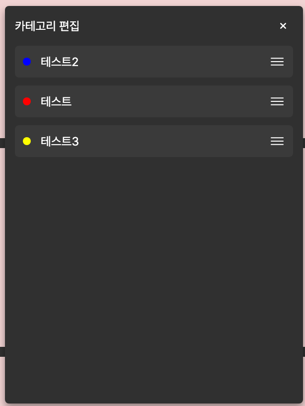 <script setup lang="ts"> import {ICONS} from "@/constant/icons.ts"; import SvgIcon from "@/components/common/SvgIcon.vue"; import CategoryItem from "@/popup/category/component/CategoryItem.vue"; import {ref} from "vue"; import Draggable from 'vuedraggable' const items = ref([ { id: '1', color: 'red', title: '테스트' }, { id: '2', color: 'blue', title: '테스트2' }, { id: '3', color: 'yellow', title: '테스트3' } ]) /* 드래그 */ const dragItemId = ref<string | null>(null) const onDragStart = (e: any) => { dragItemId.value = items.value[e.oldIndex].id } const onDragEnd = (e: any) => { dragItemId.value = null } </script> <template> <div class="popup-category-wrapper"> <div class="header"> <div>카테고리 편집</div> <svg-icon :icon="ICONS.CLOSE" :size="'large'"/> </div> <div class="content"> <draggable v-model="items" group="category" item-key="id" @start="onDragStart" @end="onDragEnd" > <template #item="{ element }"> <category-item :title="element.title" :color="element.color" :class="{'drag': element.id === dragItemId}"/> </template> </draggable> </div> </div> </template>
