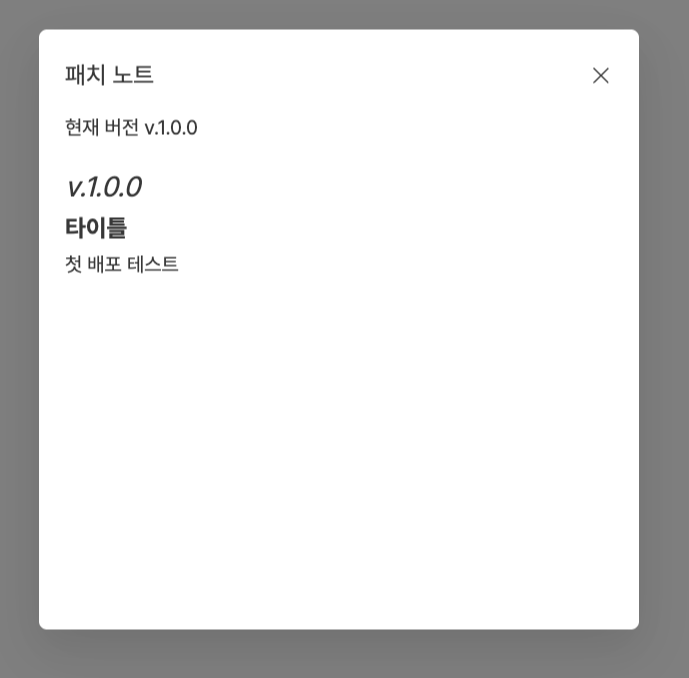 import {ref} from "vue"; export interface VersionControl { version: string; date: string; patchNoteKo: string; patchNoteEn: string; } export const currentVersion = ref('1.0.0'); export const newVersion = ref('') export const newPatchNote = ref<VersionControl[]>([]) export async function fetchSheet() { const tsvText = await window.electronAPI?.fetchSheet(); if (!tsvText) return; const [headerLine, ...rows] = tsvText.trim().split('\n'); const headers = headerLine.split('\t'); // TSV 헤더와 VersionControl 키 매핑 const headerMap: Record<string, keyof VersionControl> = { version: 'version', date: 'date', 'patchNote-ko': 'patchNoteKo', 'patchNote-en': 'patchNoteEn', }; const data: VersionControl[] = rows.map(row => { const values = row.split('\t'); const obj = {} as VersionControl; headers.forEach((header, idx) => { const key = headerMap[header.trim()]; if (key) obj[key] = values[idx]; }); return obj; }); newPatchNote.value = data const lastItem = data.length ? data[data.length - 1] : null; if (lastItem) { newVersion.value = lastItem.version } }그럼 electron 에서 엑셀에서 가져온 데이터를 보여주고 css작업을 해주면 엑셀의 데이터가 변경됨에 따라서 electron에서 엑셀의 수정된 내용이 반영되는 것을 볼 수 있다.