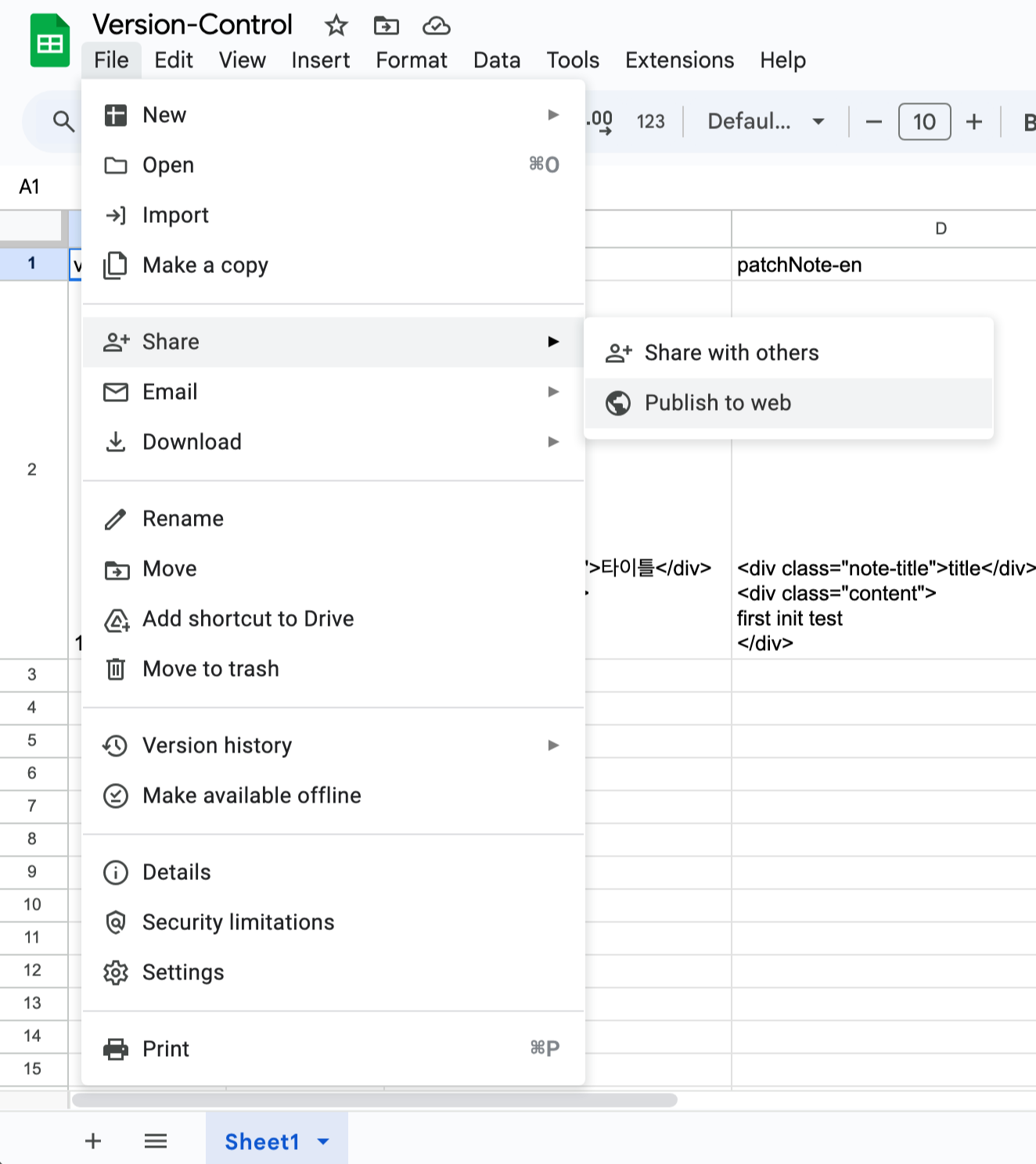 우선 구글 시트로 버전과 업데이트 날짜 업데이트 내용만을 사용