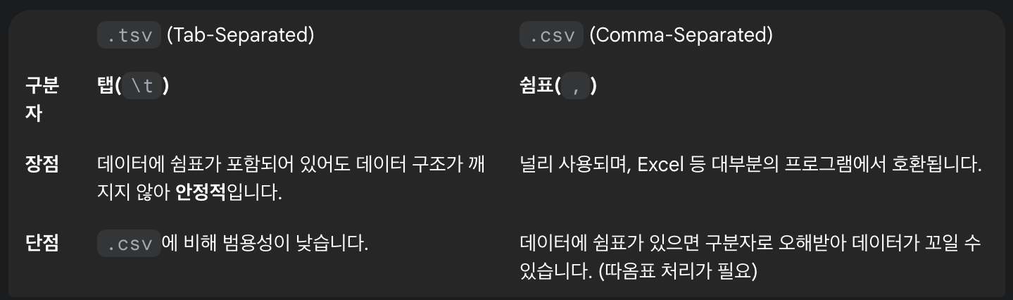 .tsv 파일로 만들어 해당 내용에 쉼표나 데이터 구조를 안정적으로 가져와서 사용할 수 있도록 한다.