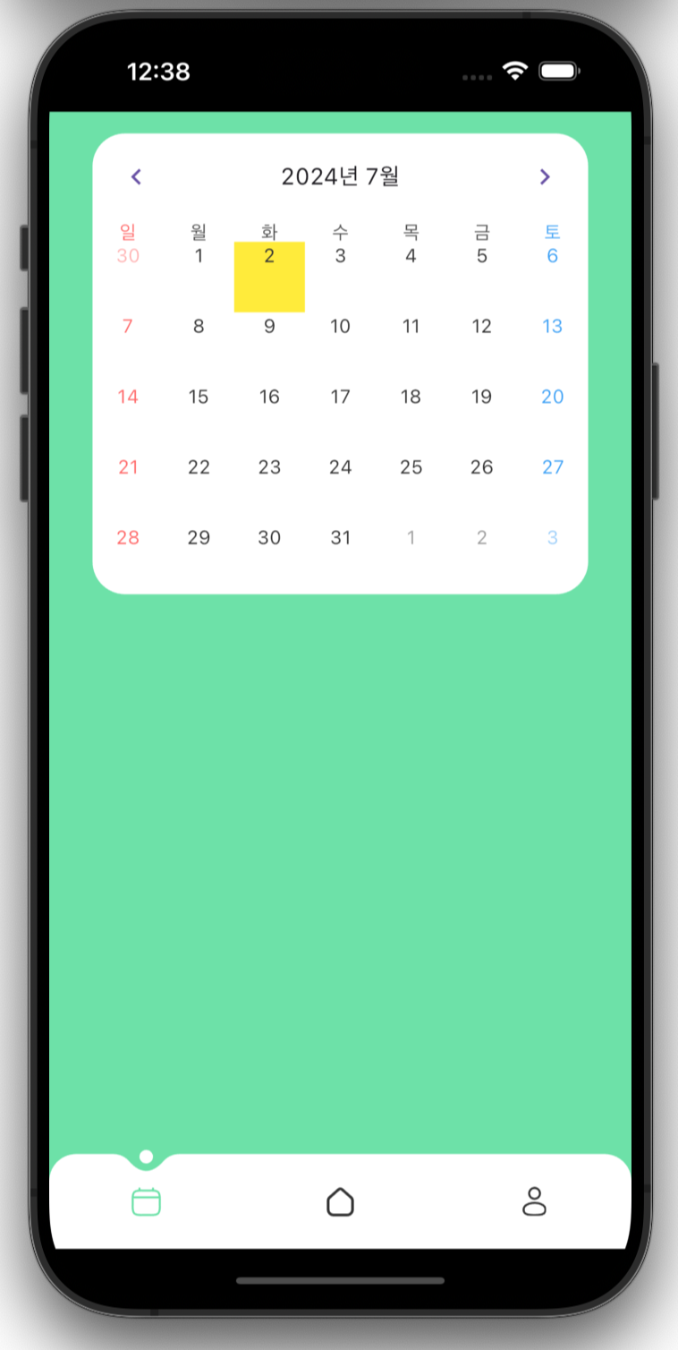 @override Widget build(BuildContext context) { return MaterialApp( debugShowCheckedModeBanner: false, home: SafeArea( child: Scaffold( backgroundColor: mint, body: mainPages[selectBtn], bottomNavigationBar: BottomNavigation( selectedBtn: selectBtn, onItemTapped: _onItemTapped, ) ), ), ); }그러면 각 탭마다 다른 메뉴를 보여주도록 할 수 있다.