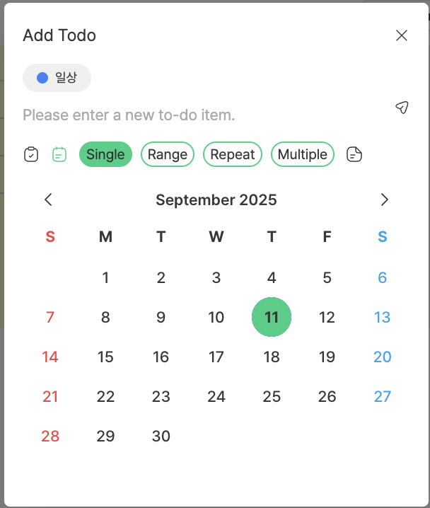 단일, 범위, 반복, 다중 일정 등록이 가능하다.