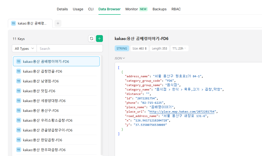 await redis.set(key,JSON.stringify(currentPlace),{ex: 86400}) return NextResponse.json({code: 200, data: currentPlace})export async function GET(request: NextRequest) { const {searchParams} = new URL(request.url) const keyword = searchParams.get("keyword") const category = searchParams.get("category") if(!keyword) { return NextResponse.json({code: 400,msg: '검색어가 없습니다.'}) } const key = `kakao:${keyword}-${category}` const cached: string | null = await redis.get(key) if (cached != null) { return NextResponse.json({code: 200, data: cached, cached: true}) } try { const currentPlace= []; for (let page = 1; page <= 1; page++) { const response = await fetch(`https://dapi.kakao.com/v2/local/search/keyword.json?query=${encodeURIComponent(keyword)}&category_group_code=${category}&page=1&size=15`, { headers: { "Authorization": `KakaoAK ${process.env.KAKAO_REST_API_KEY}` } }) const data = await response.json(); if(data.documents && data.documents.length > 0) { currentPlace.push(...data.documents) } else { break; } } await redis.set(key,JSON.stringify(currentPlace),{ex: 86400}) return NextResponse.json({code: 200, data: currentPlace}) } catch (e: any) { return NextResponse.json({code: 400,msg: e.message}) } }그럼 api요청을 했을때 해당 요청 결과가 upstash data browser를 보면 잘 저장되어있는 것을 확인 할 수 있다.
