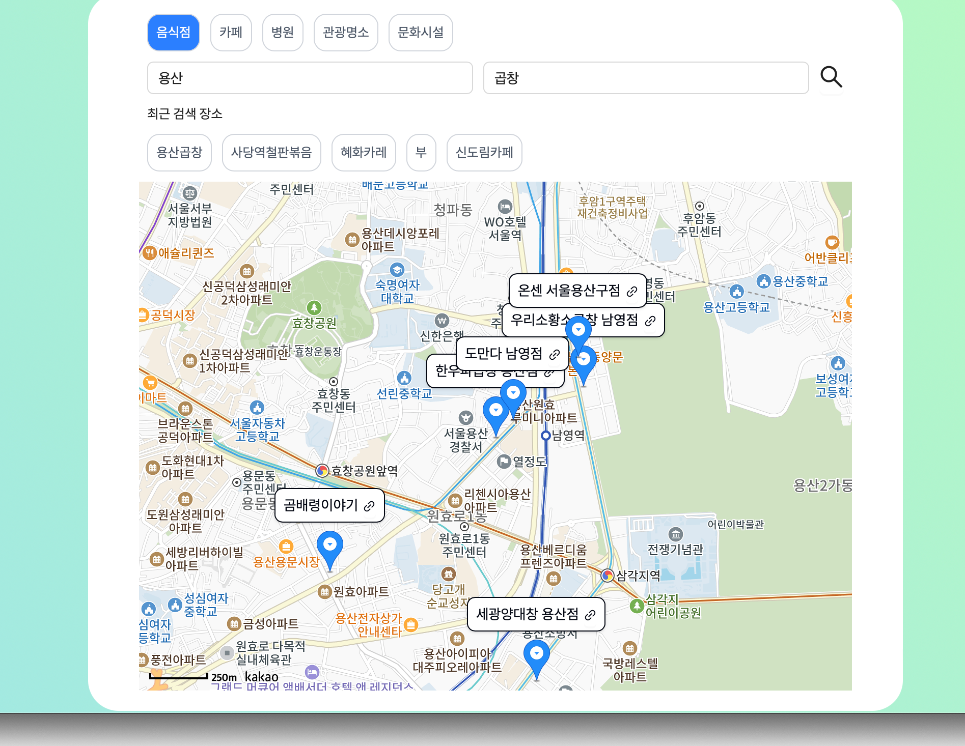 placeInfo.length > 0 && <Map center={center} // 지도의 중심 className="map-size" level={5} // 확대 레벨 > { placeInfo.map((item, index) => ( <React.Fragment key={`marker-${index}`}> <MapMarker position={{lat: parseFloat(item.y), lng: parseFloat(item.x)}} /> <CustomOverlayMap position={{ lat: parseFloat(item.y), lng: parseFloat(item.x) }} xAnchor={0.5} yAnchor={2.4} > <div className="flex gap-[5px] items-center justify-center px-2 py-1 bg-white border rounded-lg shadow text-sm text-gray-950"> <div>{item.place_name}</div> <Button className="!text-gray-950" size="small" icon={<LinkOutlined />} onClick={() => handleClickKaKaoMap(item)} /> </div> </CustomOverlayMap> </React.Fragment> )) } </Map>그러면 이제 검색을 해보면 해당 장소의 마커가 정상적으로 표시된다.