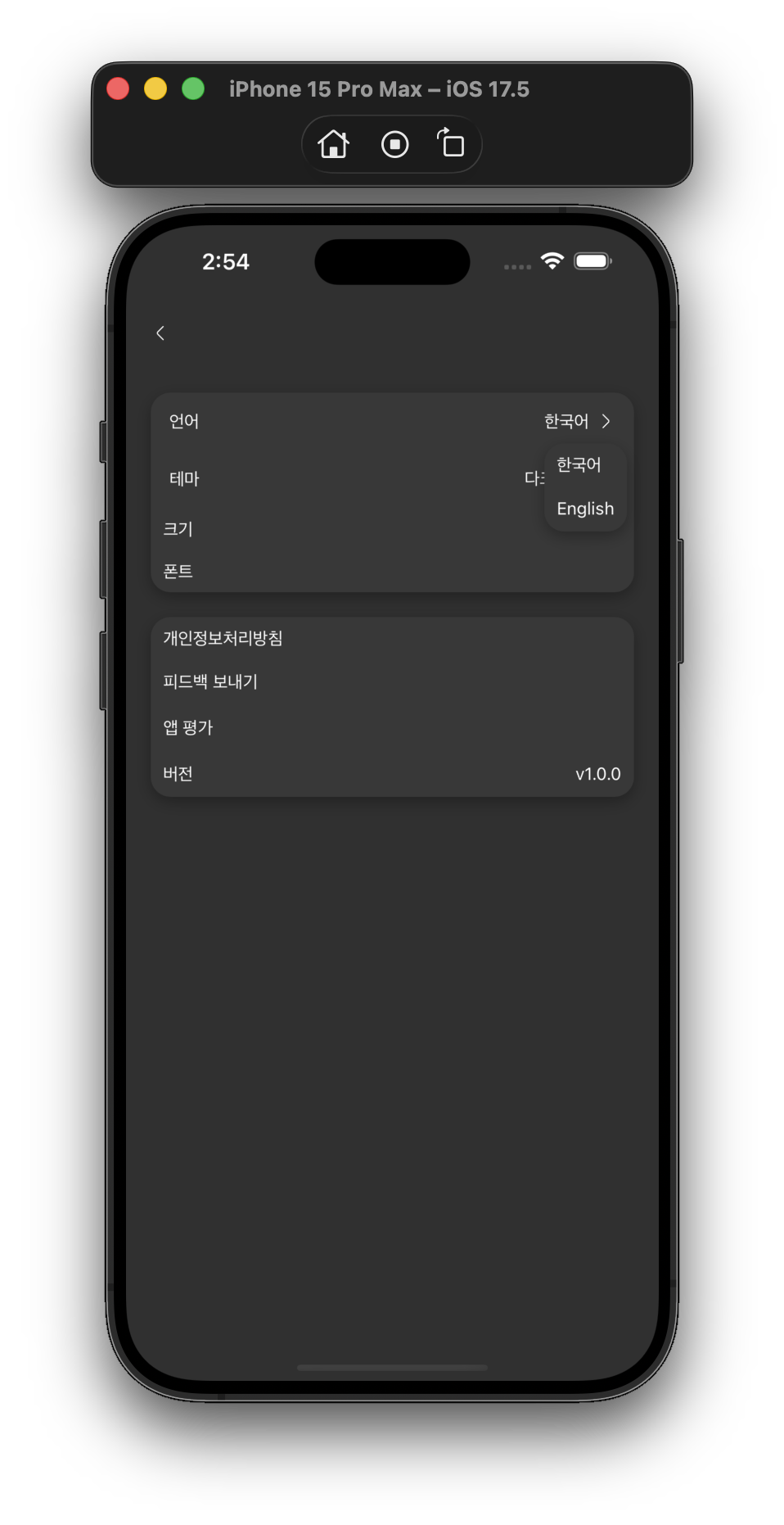 const {i18n} = useTranslation() const appStore = useAppStore() const [isReady, setIsReady] = useState(false) useEffect(() => { ( async () => { const storageTheme = await getThemeStorage() if(storageTheme) { appStore.setTheme(storageTheme) await setTheme(storageTheme) } else { appStore.setTheme('white') await setTheme('white') } const storageLang = await getLangStorage() if(storageLang) { appStore.setLang(storageLang) await setLang(storageLang) await i18n.changeLanguage(storageLang) } else { appStore.setLang('en') await setLang('en') await i18n.changeLanguage('en') } setIsReady(true) })() },[]) // 스플래쉬 하면 필요 if(!isReady) return null; return ( <SafeAreaProvider> <SafeAreaView style={{ flex: 1, backgroundColor: theme.app_theme_background }}> <Host> <StackNavigation/> </Host> </SafeAreaView> </SafeAreaProvider> );이러면 언어 변경을 하면 설정안 언어로 변경되고, 이후 새로고침해도 저장된 언어로 변경된다.