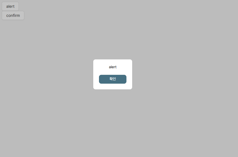 {type === "alert" && ( <div className="cursor-pointer bg-[#477082] hover:bg-[#687E88] p-2 rounded-lg text-white w-24 text-center" onClick={() => onClose(true)}>확인</div> )} {type === "confirm" && ( <div className="flex gap-2.5"> <div className="cursor-pointer bg-[#477082] hover:bg-[#687E88] p-2 rounded-lg text-white w-24 text-center" onClick={() => onClose(true)}>확인</div> <div className="cursor-pointer p-2 rounded-lg w-24 text-center bg-gray-200 hover:bg-gray-300" onClick={() => onClose(false)}>취소</div> </div> )}alert과 confirm은 어디서든 사용할 수 있어야하므로